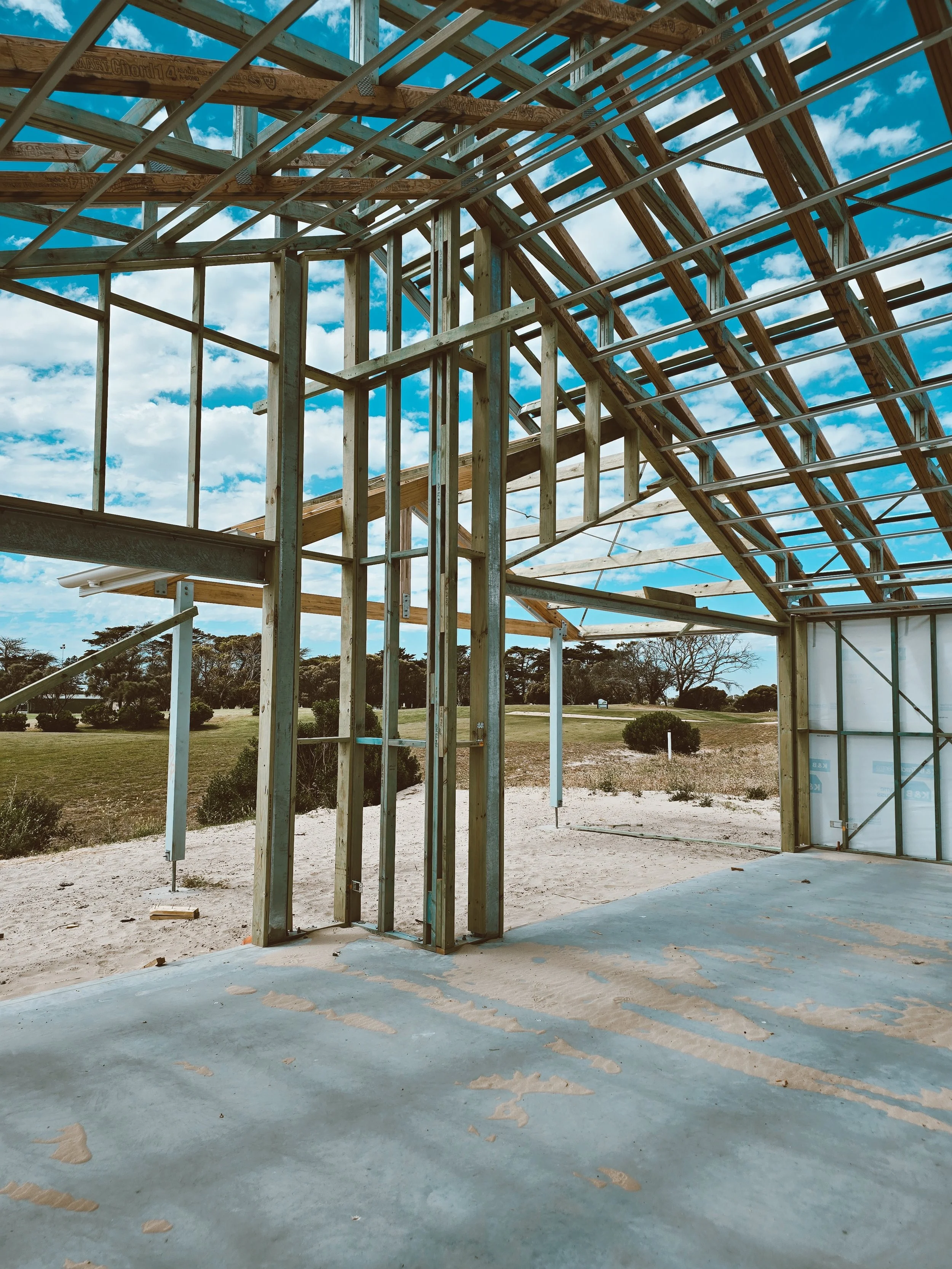 Wooden framework of a house under construction against a blue sky. Inspections, framing, Australia, timber frames, Australian Standards, NCC, National Construction Code